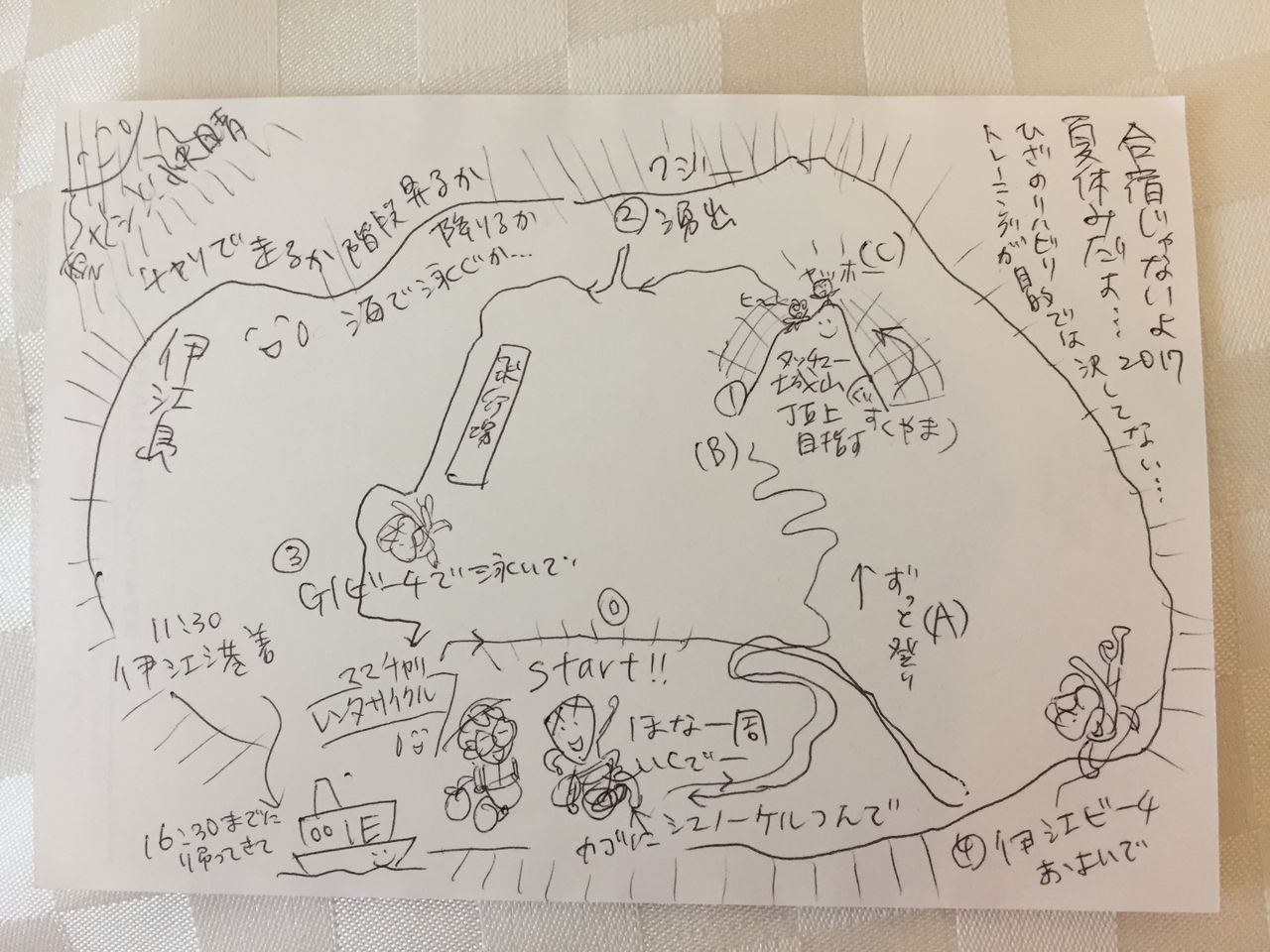 ようやくてっぺんにたどり着いてヘタレていたら「まだまだやな〜♪」再び三段飛ばしで降りていく(しかも日に日に焦げて行くので木陰に入ると見失う!)後ろ姿を追いかけながら、膝をガクガクさせて自転車置き場まで降り、この後も、島の滞在5時間をめいいっぱい使って、ひたすらチャリで走るか、階段を登るか降りるか、ビーチを潜るか泳ぐかし続けて、港へ帰ってきました。