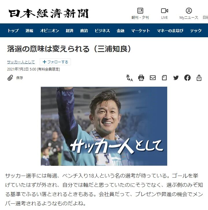 三浦知良「サッカー人として」日本経済新聞